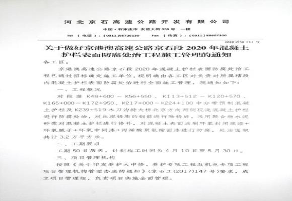 京港澳高速公路京石段沙2020年混凝土護欄表面防腐處治工程施工管理的通知
