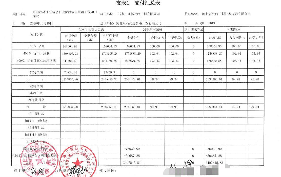 京港澳高速公路京石段橋涵病害處治工程QH-1標(biāo)段工程支付證書(shū)