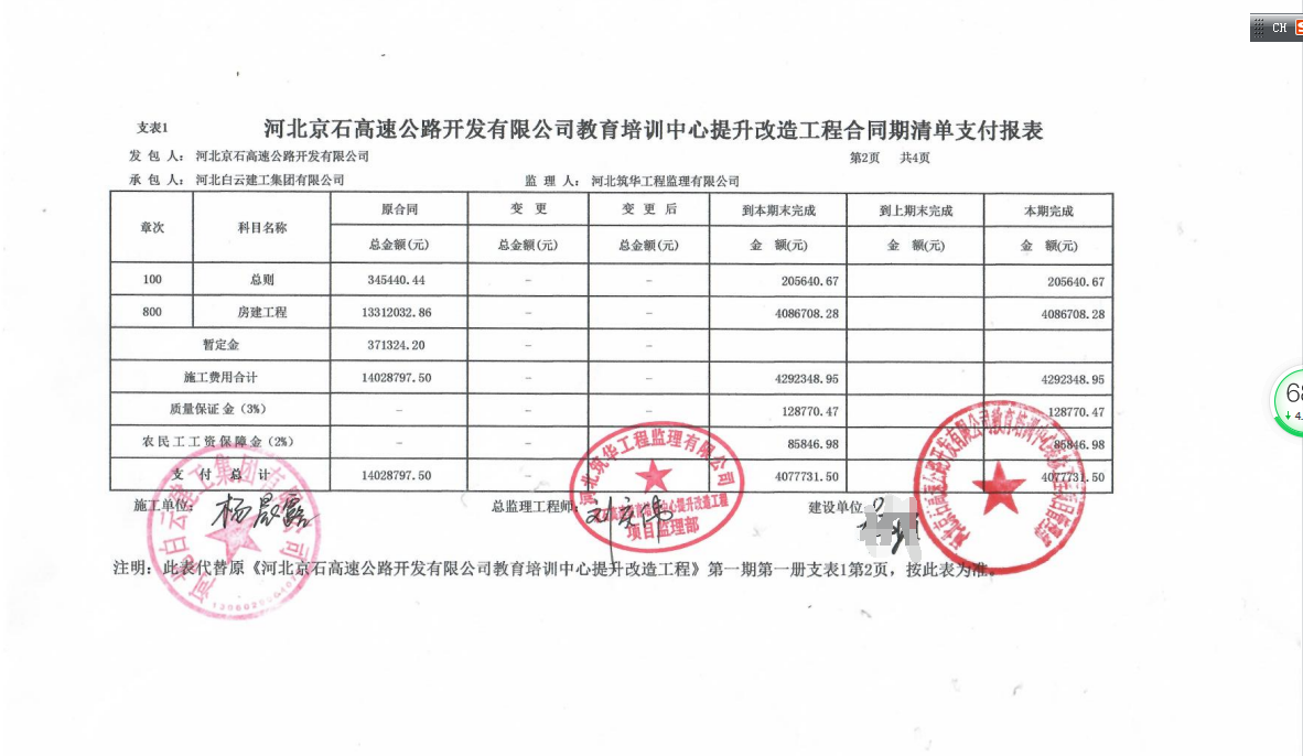 河北京石高速公路開發(fā)有限公司教育培訓中心提升改造工程一期支付證書