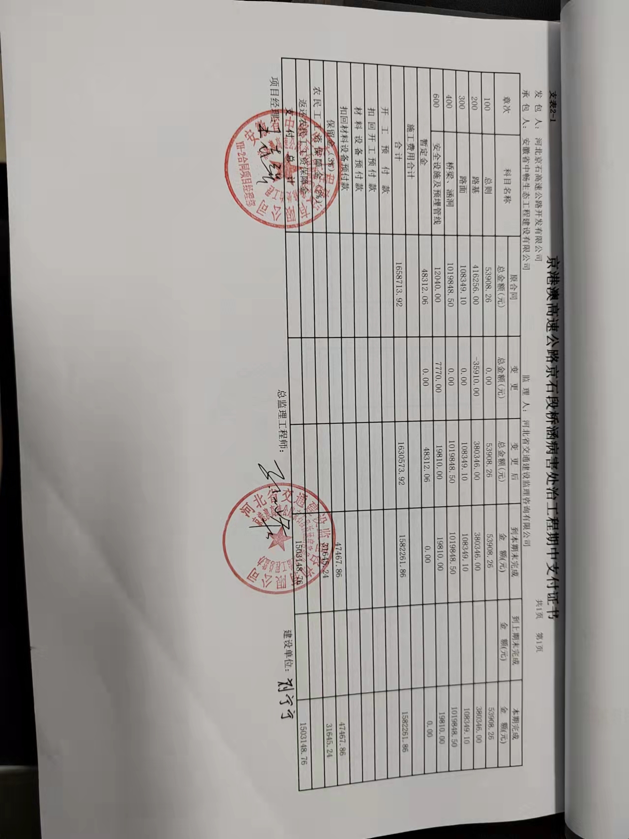 京港澳高速公路京石段橋涵病害維修處治工程YH-2標(biāo)段支付證書(shū)