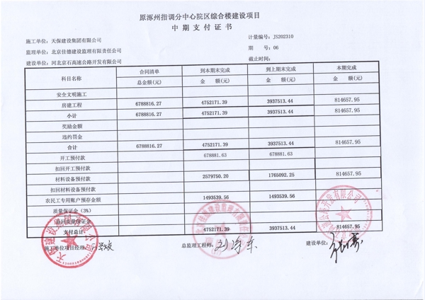 原涿州指調(diào)分中心院區(qū)綜合樓建設(shè)項(xiàng)目第六期中期支付證書