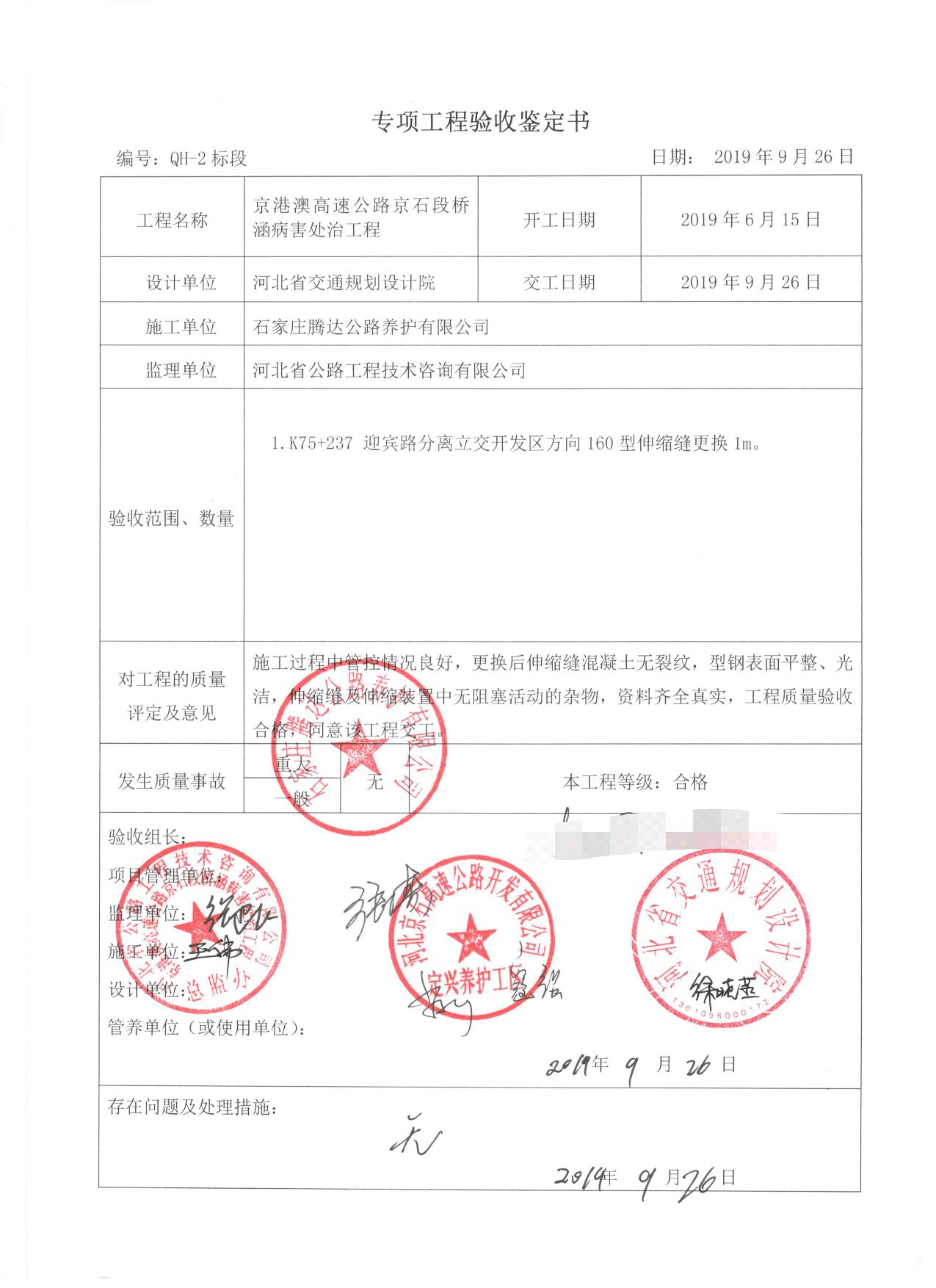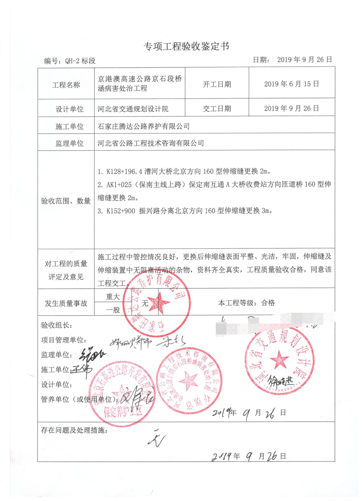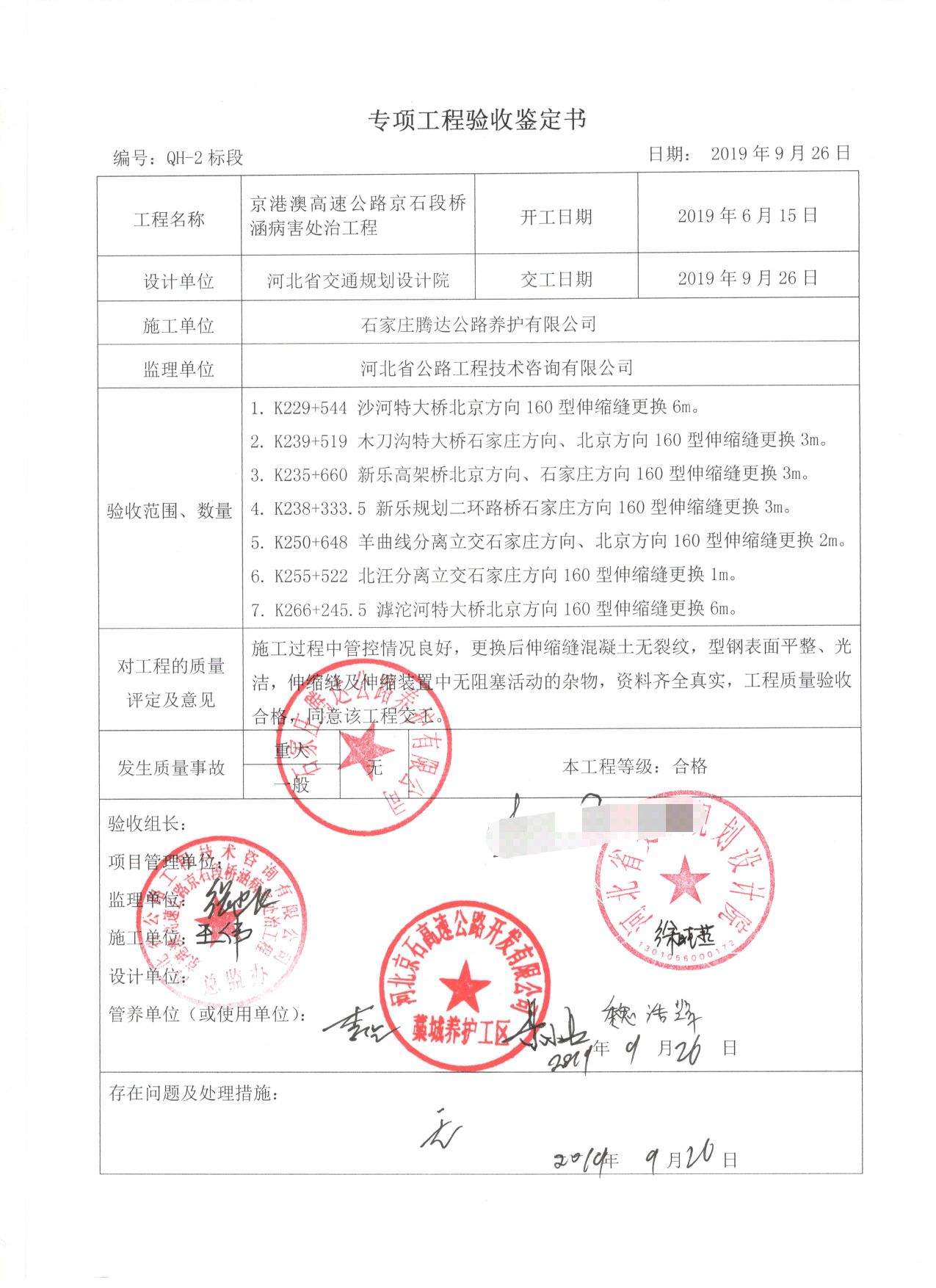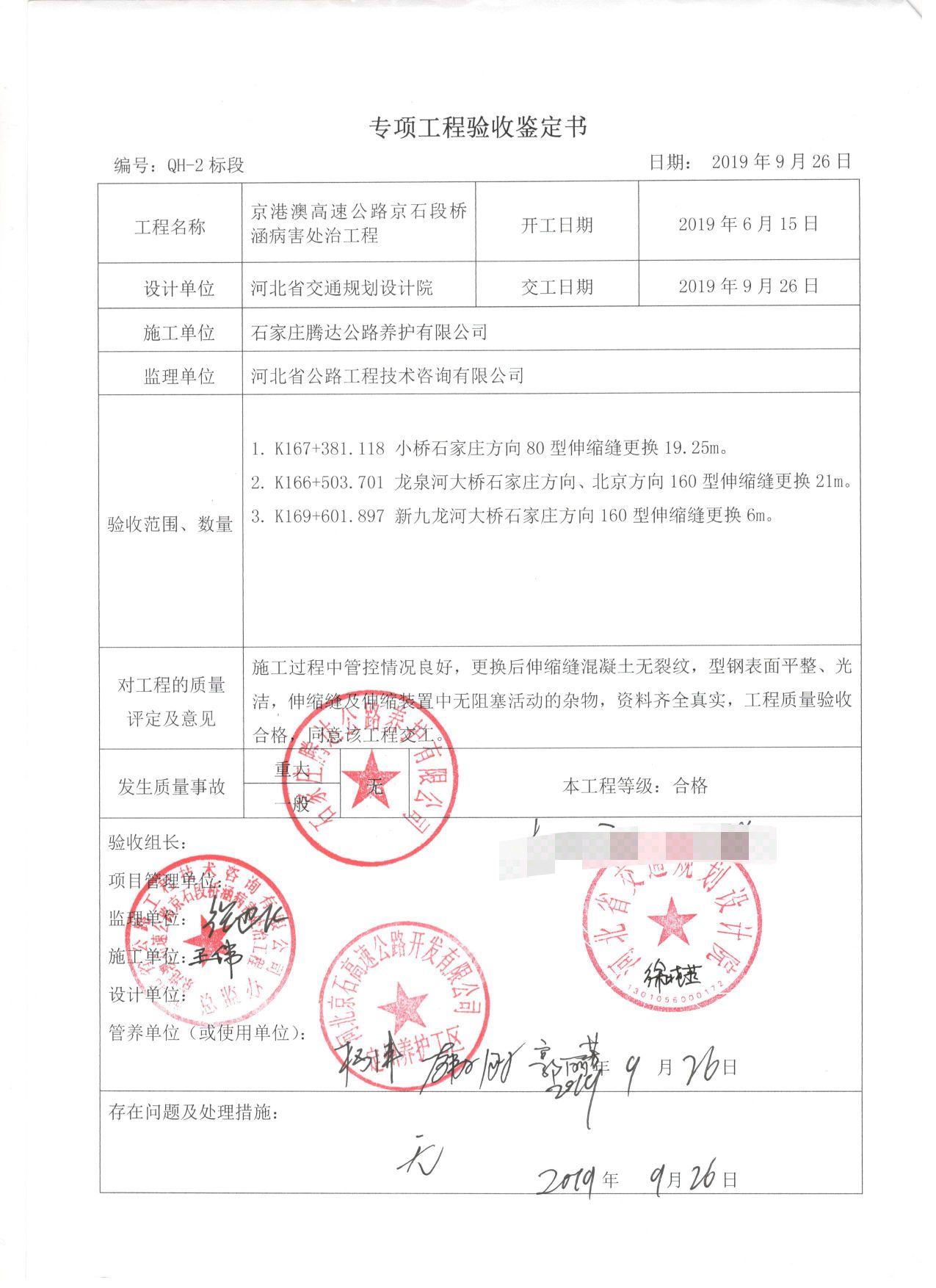 京港澳高速公路京石段橋涵病害處治工程QH-2標(biāo)段工程專項(xiàng)鑒定書(shū)