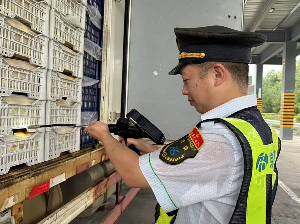 正午時(shí)分,收費(fèi)站廣場(chǎng)地表溫度直逼60℃,瀝青路面泛起微光。黨員們身著反光背心,手持查驗(yàn)終端,穿梭于一輛輛綠通貨車(chē)之間。掀開(kāi)篷布時(shí),撲面而來(lái)的熱浪裹挾著果蔬氣息,他們卻無(wú)暇擦拭額頭豆大的汗珠,仔細(xì)核對(duì)貨物品類(lèi)、查驗(yàn)裝載空間、拍攝留存影像?!跋募竟瞎赘瘔模轵?yàn)速度就是效率,更是民生溫度?!?/p>