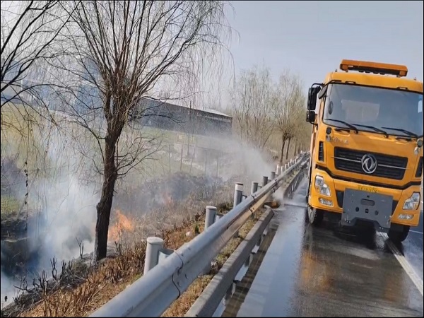 火情就是命令,巡查人員迅速做出反應,采取應急措施,即刻兵分兩路。其中一組迅速將巡查車后移,在上游位置打開警報器、警示燈,警示車輛減速謹慎通過;另一組迅速取用隨車滅火工具展開撲救。因火勢過猛,人工滅火難以控制,工區(qū)緊急抽調附近正在進行綠化澆水作業(yè)的水車前來支援。經(jīng)過近30分鐘全力撲救,火情被撲滅,保障了過往車輛安全通行。