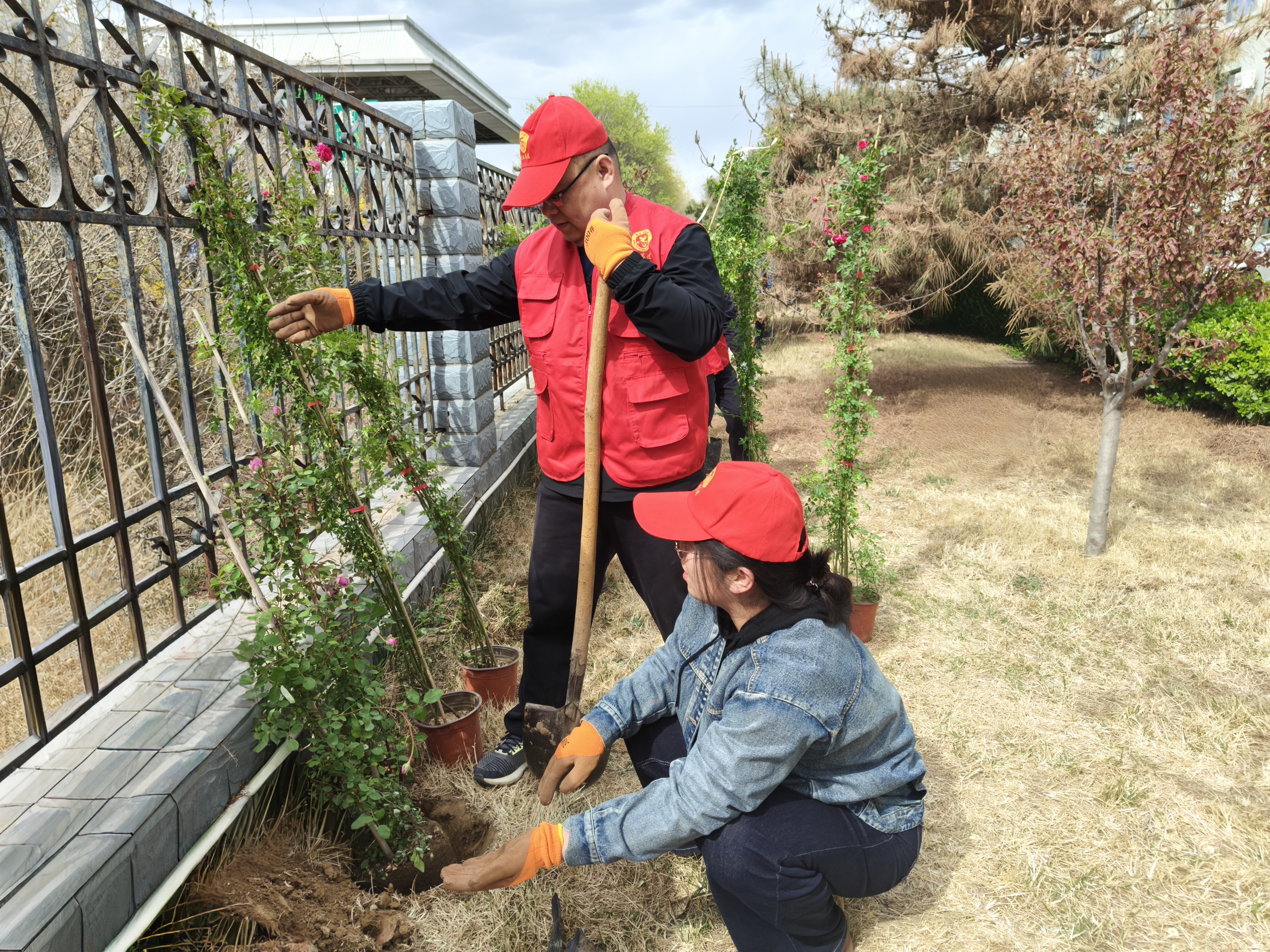 說干就干,經(jīng)過分工部署,同事們化身“園林工匠”,有的拿鐵鍬挖坑填土,有的拿剪刀修剪花枝,經(jīng)過兩個小時的團結奮戰(zhàn),一棵棵花木沿著柵欄圍墻整齊地栽種成一排,隨著一股清冽的水流緩緩流淌而來,滲入每一寸土壤,每一棵花木都煥發(fā)出勃勃生機。原本單調的鐵藝圍欄上,薔薇與月季編織成延綿的花帶,粉紅、明黃、雪白的花朵在風中搖曳,像一串跳動的音符,為春日增添了些許詩意與溫情。