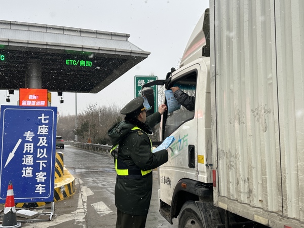 收費(fèi)員利用車輛通行間隙,主動(dòng)提醒過往車輛注意雪天路滑、減速慢行。同時(shí),向司乘人員發(fā)放雪天行車安全宣傳單,并提供印有冬季行車注意事項(xiàng)的實(shí)用濕巾,幫助駕駛員提升安全意識(shí)。
