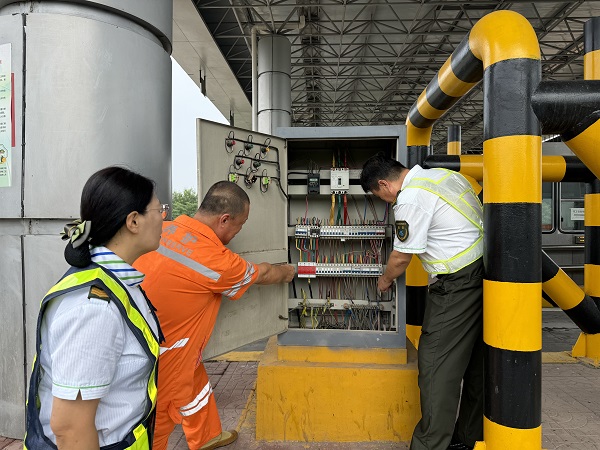 強降雨來臨,定興站迅速行動,全力應(yīng)對。一方面,時刻關(guān)注排水通道排水情況,排水口臨近區(qū)域放置清淤工具,對雜物和淤泥進行拉網(wǎng)式清理,確保排水順暢。同時檢查排水泵供電線路和運行狀態(tài),提前啟動備用排水泵,增強低洼區(qū)域排水能力,形成“前端清淤—中端導(dǎo)流—末端強排”的全流程排水體系。另一方面,對地勢較低的區(qū)域,堆放防汛沙袋,筑起堅固“防線”,有效阻擋了雨水的侵入。安排專人在收費車道關(guān)注車道內(nèi)情況,通過手持擴音器,提醒司乘人員“減速慢行、保持車距、謹慎通過積水路段”,注意行車安全,在愛心驛站配備雨衣、手電等應(yīng)急幫助物品,以備惡劣天氣下協(xié)助駕駛員安全撤離。