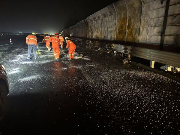 現(xiàn)場作業(yè)人員爭分奪秒地對事故現(xiàn)場進(jìn)行清理和救援。清障救援隊(duì)利用專業(yè)設(shè)備,將受損車輛快速拖離現(xiàn)場,工區(qū)作業(yè)人員利用大型機(jī)械清理路面上的散落物,同時為防止路面結(jié)冰,在清理后的事故路段撒布了融雪劑。經(jīng)過近三個小時緊張有序的奮戰(zhàn),事故現(xiàn)場的散落物終于被清理干凈,路面恢復(fù)了正常通行。