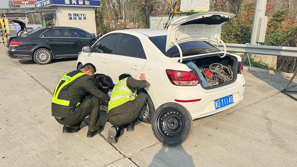 11月4日,京石高速定興收費站口,一輛白色轎車駛出收費車道時,左后輪胎已然癟氣。值班工作人員第一時間示意司機??堪踩恢茫⒀杆僬归_檢查。