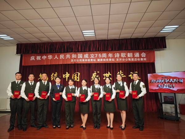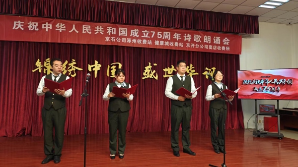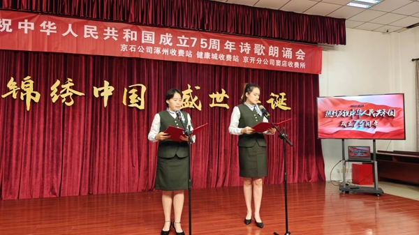 錦繡中國,盛世華誕,七十五載,征程如虹。為隆重慶祝中華人民共和國成立七十五周年,延續(xù)京冀兩地高速收費站共建深情,共同抒發(fā)熱烈的愛國情懷,9月30日上午,健康城收費站、涿州收費站黨支部聯(lián)合兩站分會與京開分公司竇店收費所,在健康城站共同開展了慶祝中華人民共和國成立75周年詩歌朗誦會活動。奮斗在祖國交通事業(yè)一線的工作者們,滿懷豪情,把對祖國的無盡熱愛熔鑄于一首首激情澎湃的詩篇之中,以詩的激昂韻律,歌頌祖國的壯麗騰飛。